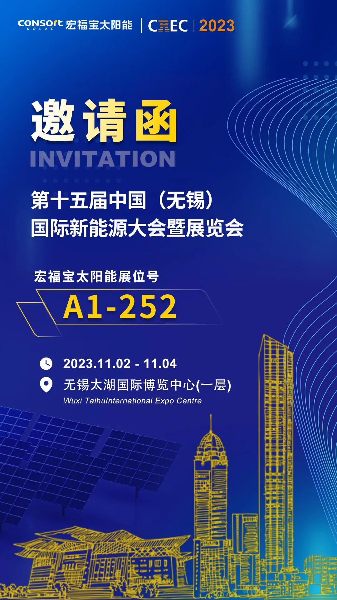 第十五届中国(无锡)国际新能源大会暨展览会 2023年11月02日-04日,由中国国际商会、江苏省贸促会和无锡市人民政府主办的“第十五届中国(无锡)国际新能源大会暨展览会”将继续在无锡太湖国际博览中心举行。 本届大会将立足江苏,聚焦热点,重点关注光伏、储能、风电、氢能等新能源应用及推广,通过举办高端论坛和精品展览,打造”风光储充氢”一站式采购平台,致力于为全行业实现“碳中和”目标,推广新能源解决方案。展览方面将集中展示太阳能光伏、风电、储能、氢能以及新能源汽车、充电桩等新产品、新技术和新应用。论坛将围绕如何实现“碳中和”目标、如何升级先进光伏技术、如何开展工商业储能等业界热点话题展开研讨,并将举行 “碳中和行动50人论坛” “新能源国际合作论坛”“全球光伏产业峰会”“中国分布式光伏+储能大会”等高端会议。 CREC作为中国第一个关注新能源终端应用的展会,已经成为新能源领域顶级行业嘉年华,是政府部门、公共机构、工业园区、工商企业等单位了解新能源、获取智慧综合能源服务的首选! 展会地点:无锡太湖国际博览中心(一层) (江苏省无锡市滨湖区) 宏福宝太阳能展位号:A1-252